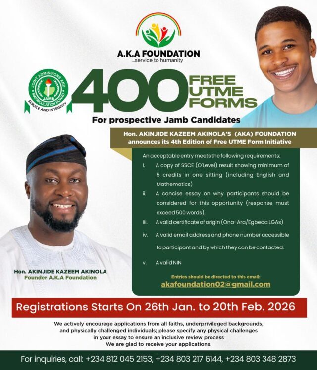 In another inspiring edition of its Free JAMB Forms initiative for 2026, the Akinjide Kazeem Akinola Foundation, popularly known as AKA Foundation, has announced that 400 prospective candidates will benefit from the benevolence of the House of Representatives aspirant for Egbeda/Ona-Ara Federal Constituency, Oyo State, Nigeria.