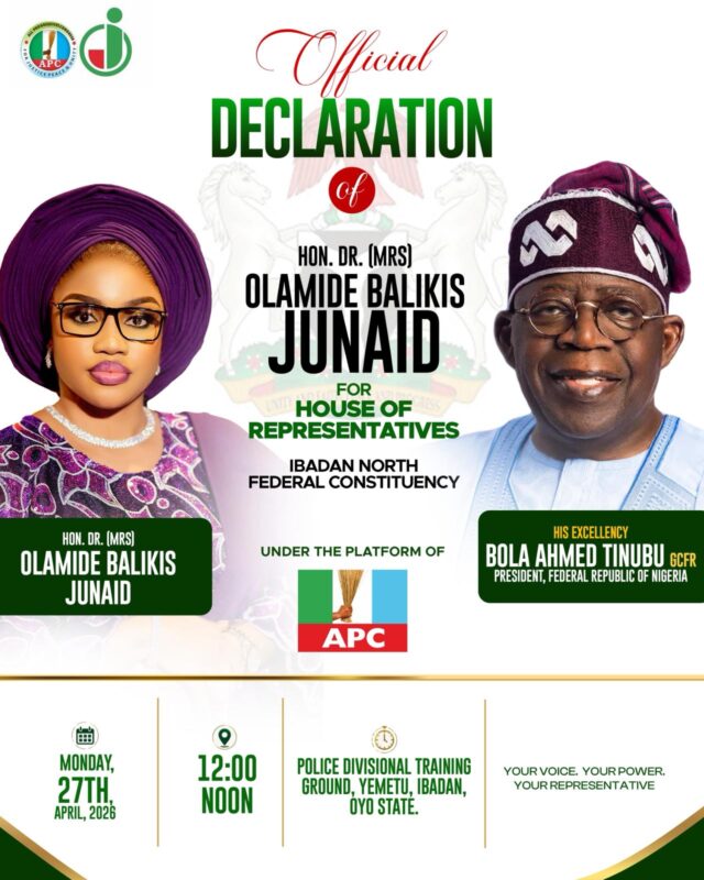 All is set for the official declaration of Hon. Dr. (Mrs) Olamide Balikis Junaid as she officially joined the race to represent Ibadan North Federal Constituency in the House of Representatives.