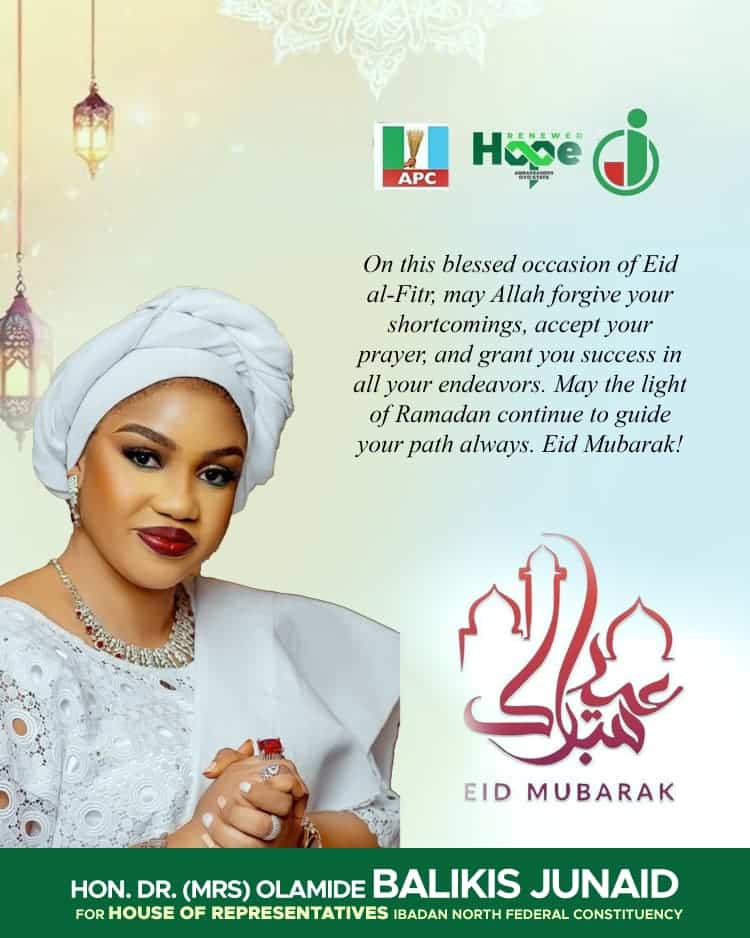 Dr. Olamide Junaid, a leading aspirant for the Ibadan North Federal Constituency and chieftain of the All Progressives Congress (APC), has felicitated Muslim faithful and Nigerians at large on the occasion of Eid-el-Fitr.