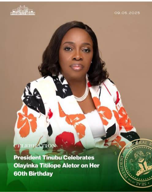 President Bola Ahmed Tinubu rejoices with lawyer, businesswoman and philanthropist Chief (Mrs) Olayinka Titilope Aletor as she marks her 60th birthday. Chief (Mrs.) Olayinka Aletor clocked 60 on May 10, 2025.